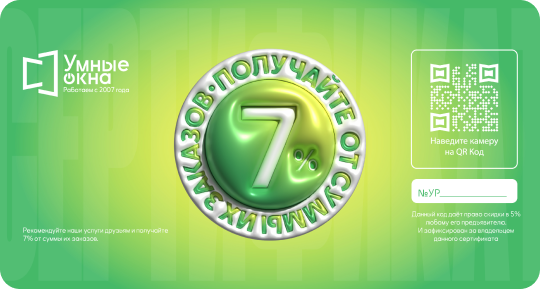 Скидка 7% новому клиенту и бонус 7% для рекомендателя. Можно получить в качестве «секретного приза» от замерщика.